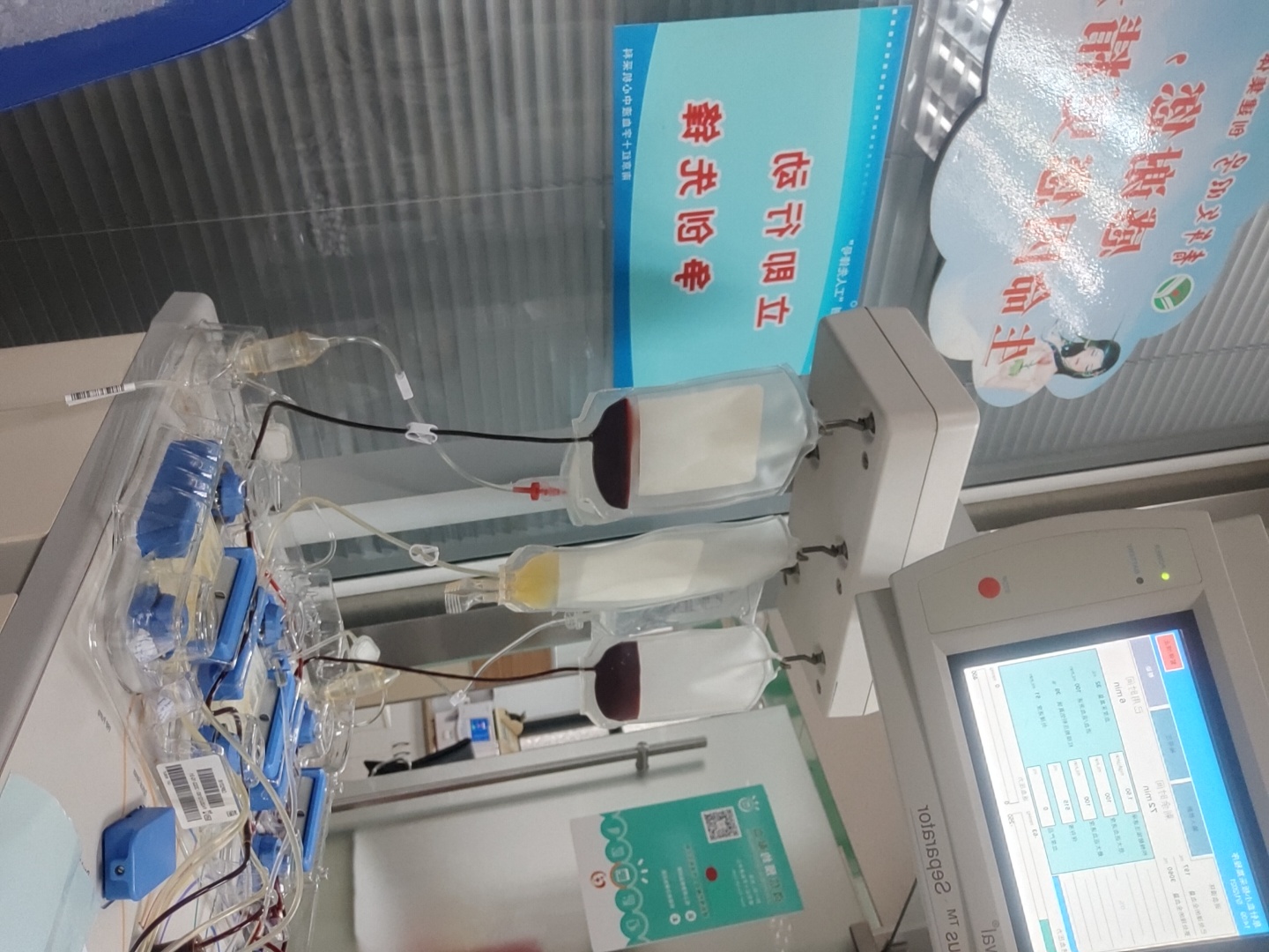 到了5月1号,我到红十字会献了血小板(图一),我的血小板含量很高,抽40分钟就够两个治疗量了(正常应该是一小时)。