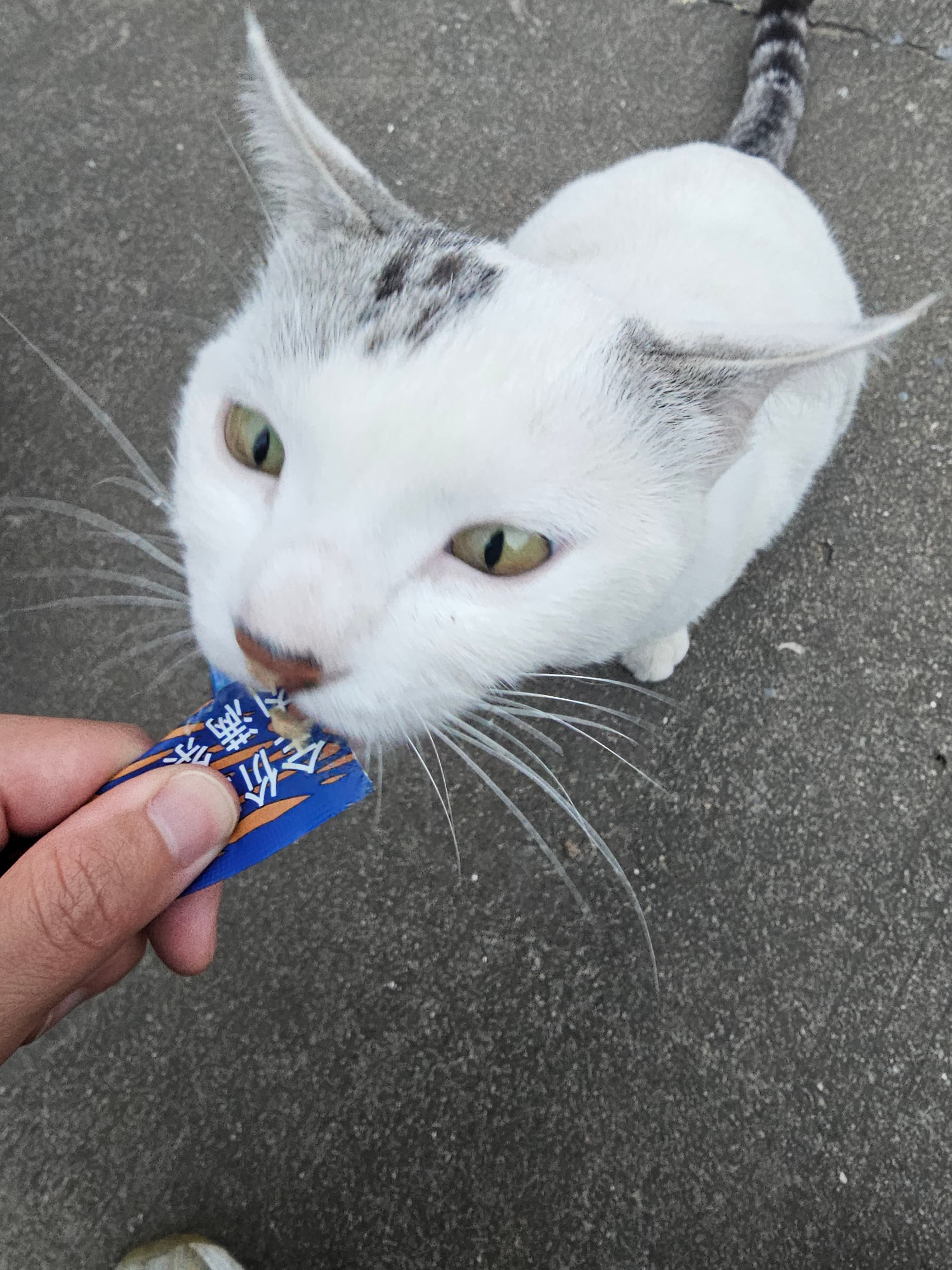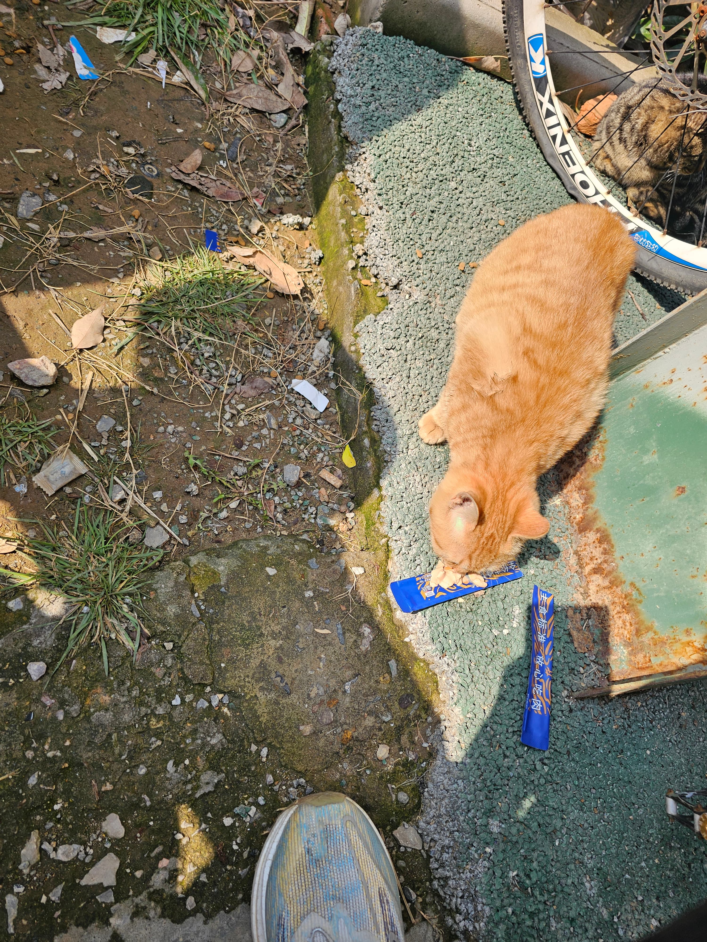 图四是小区的猫,怕人,猫条挤到地上才会吃,不过后面经常喂就好些了